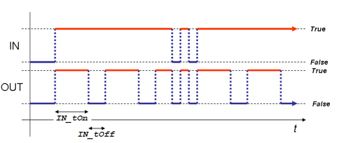 If the IN_xActive input parameter is set to True, the OUT_xSignal output parameter should immediately follow and be set to True. As long as IN_xActive is set to True, the OUT_xSignal should be set to True for the time specified for IN_tOn and then switch to False for the time specified for IN_tOff. This switching shall continue until IN_xActive is set to False. In this case, the OUT_xSignal should also change to False immediately.
