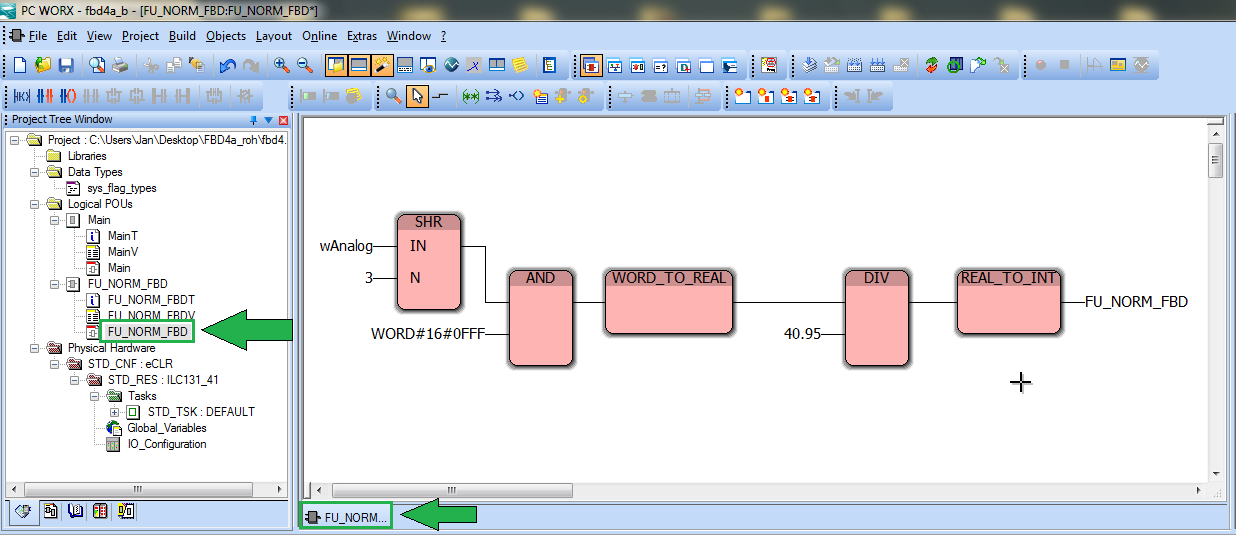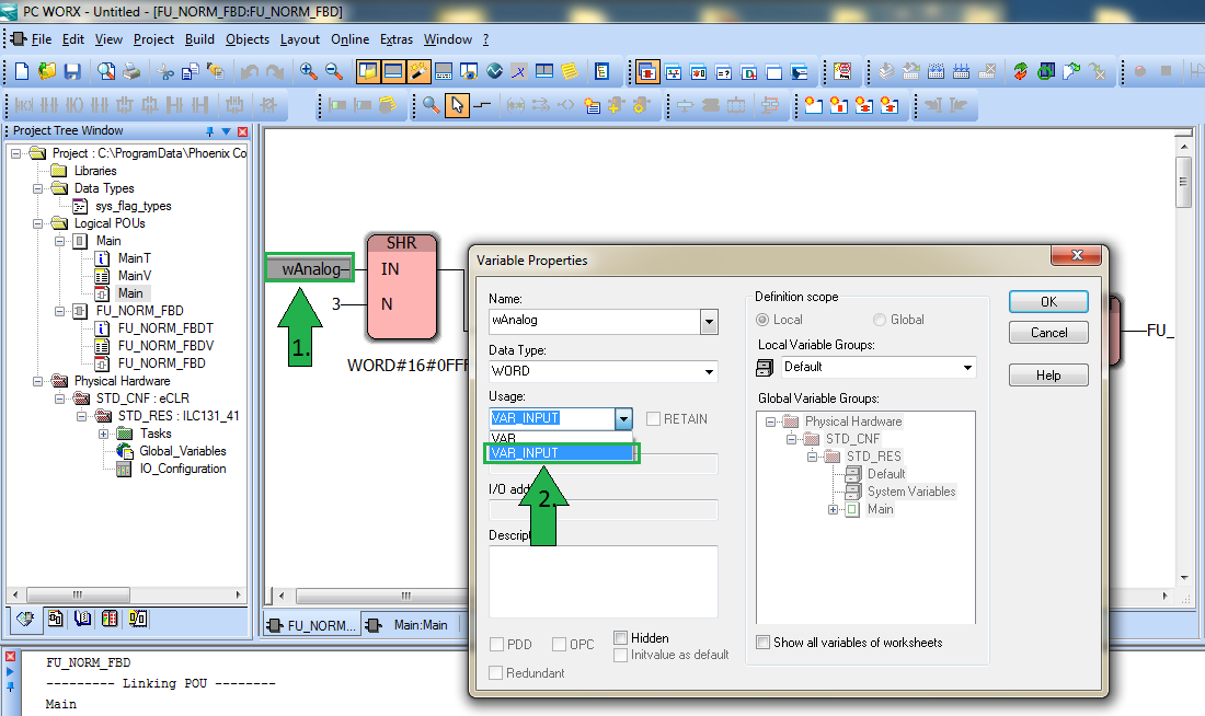 Change the Data Type of "wAnalog" to WORD and the Usage to VAR_INPUT.